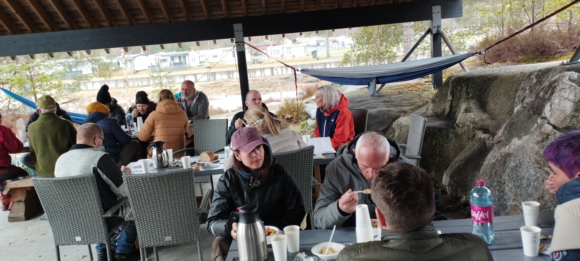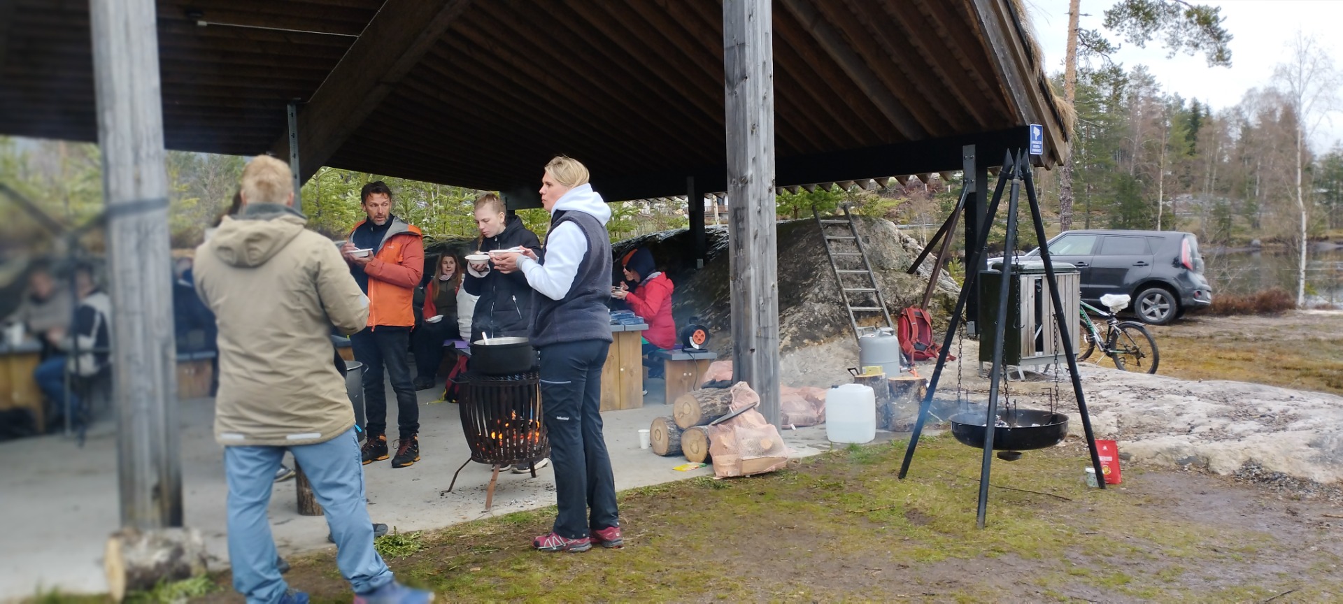 Den første dagen med regn og kulde var vi skjermet under et stort tak som gjorde at vi kunne ha en vakker utsikt over naturen. Den menneskelige varmen og også en utsøkt tilberedning av suppe laget på bålet, ga et gunstig miljø for å lytte til fagfolk og brukere hvor viktig det er for mental helse, å bruke naturen og utføre oppgaver likt i forhold til å tenne bål. matlaging osv.