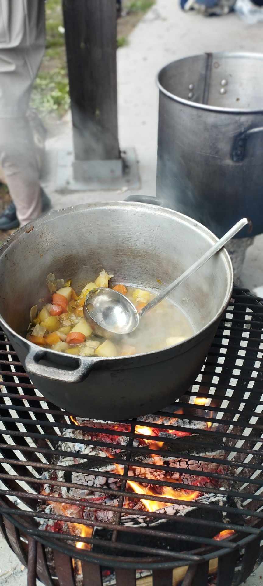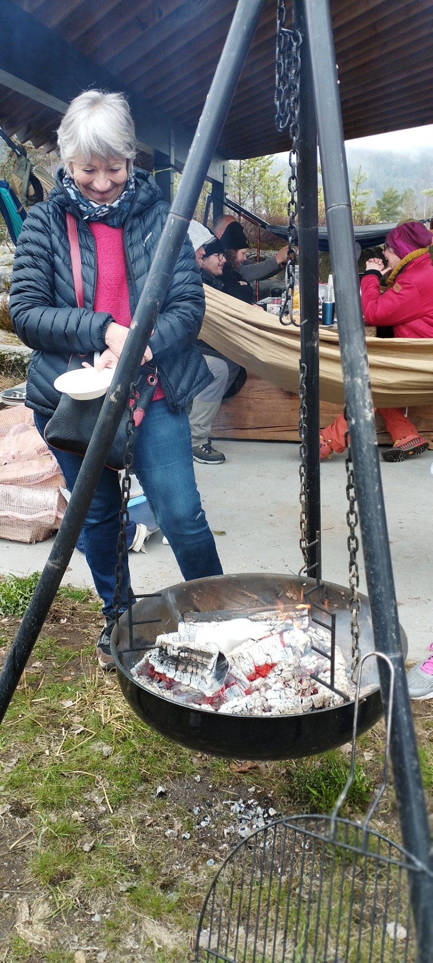 Den første dagen med regn og kulde var vi skjermet under et stort tak som gjorde at vi kunne ha en vakker utsikt over naturen. Den menneskelige varmen og også en utsøkt tilberedning av suppe laget på bålet, ga et gunstig miljø for å lytte til fagfolk og brukere hvor viktig det er for mental helse, å bruke naturen og utføre oppgaver likt i forhold til å tenne bål. matlaging osv.